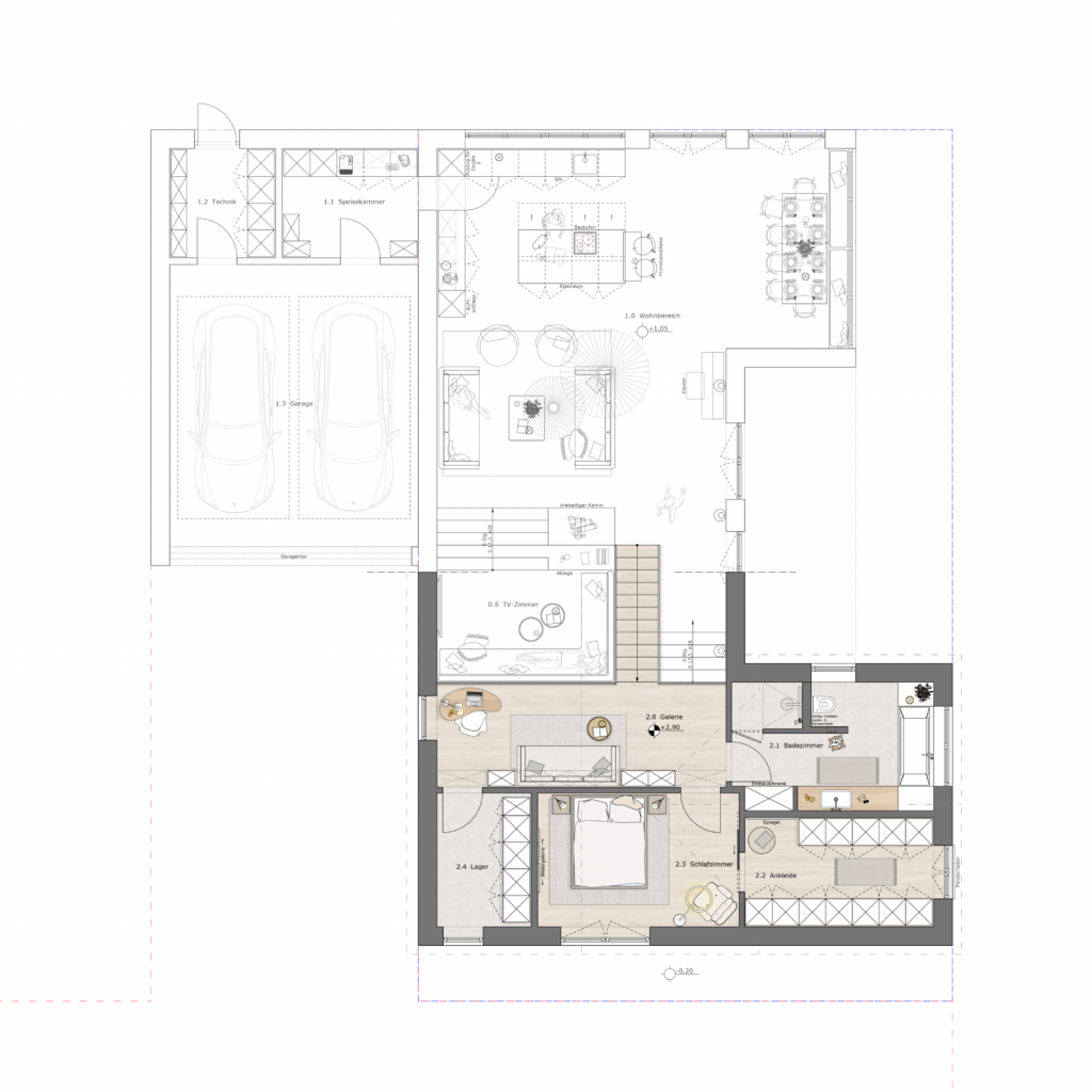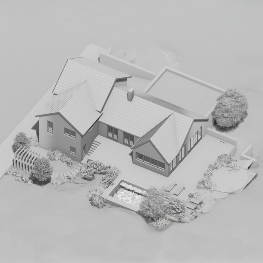 Im Mittelpunkt der Planung steht der Neubau selbst, der sich durch seine U-förmige Gebäudeform und das klassische Satteldach harmonisch in die Hanglage des Grundstücks einfügt. Die durchdachte Anordnung der Baukörper schafft einen geschützten Innenhof mit großzügiger Terrasse, die zwischen den beiden Fassaden eingebettet liegt und so einen intimen Rückzugsort im Außenraum bildet. Unterstützt wird die Atmosphäre von einer romantisch-organisch gestalteten Gartenanlage, die das Gesamtbild der Anlage zu einem stimmigen Wohlfühlort abrundet.