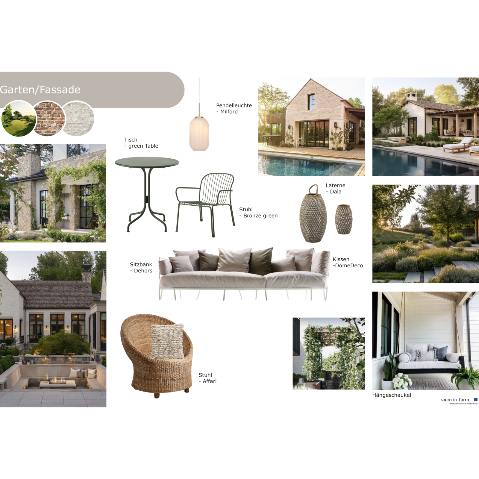 Im Mittelpunkt der Planung steht der Neubau selbst, der sich durch seine U-förmige Gebäudeform und das klassische Satteldach harmonisch in die Hanglage des Grundstücks einfügt. Die durchdachte Anordnung der Baukörper schafft einen geschützten Innenhof mit großzügiger Terrasse, die zwischen den beiden Fassaden eingebettet liegt und so einen intimen Rückzugsort im Außenraum bildet. Unterstützt wird die Atmosphäre von einer romantisch-organisch gestalteten Gartenanlage, die das Gesamtbild der Anlage zu einem stimmigen Wohlfühlort abrundet.