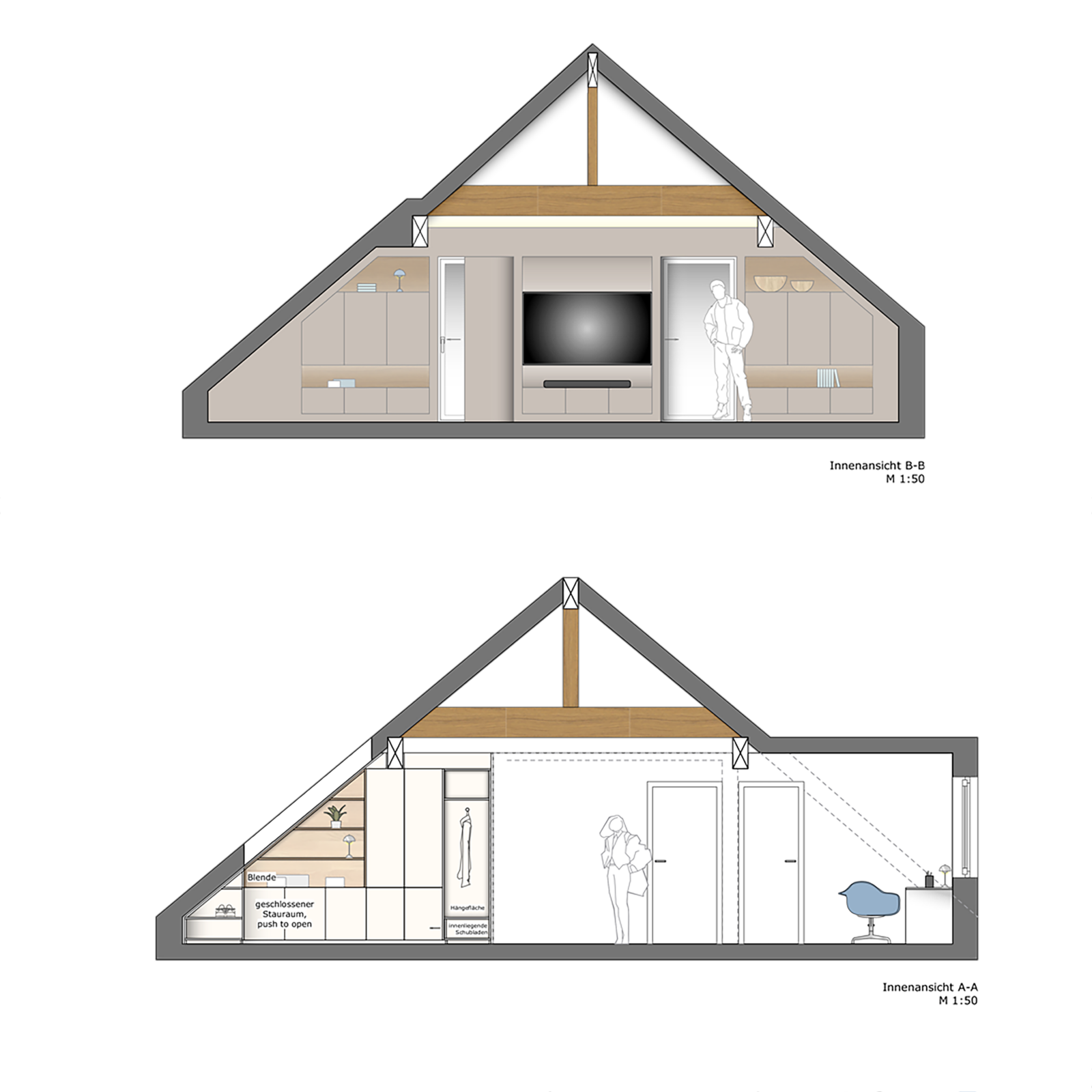 Das Ergebnis ist ein vielseitig nutzbarer Raum, der die Funktionen Heimkino, Wohnzimmer, Arbeitsplatz und Stauraum intelligent verbindet – abgestimmt auf die Wünsche der Bauherren und mit einem klaren gestalterischen Anspruch. Durchdachte Einbauten, stimmige Materialien, maßgeschneiderte Lösungen und eine ausgewogene Farb- und Lichtgestaltung machen das Dachgeschoss zu einem modernen, wohnlichen Rückzugsort mit funktionaler Tiefe und architektonischer Klarheit.
