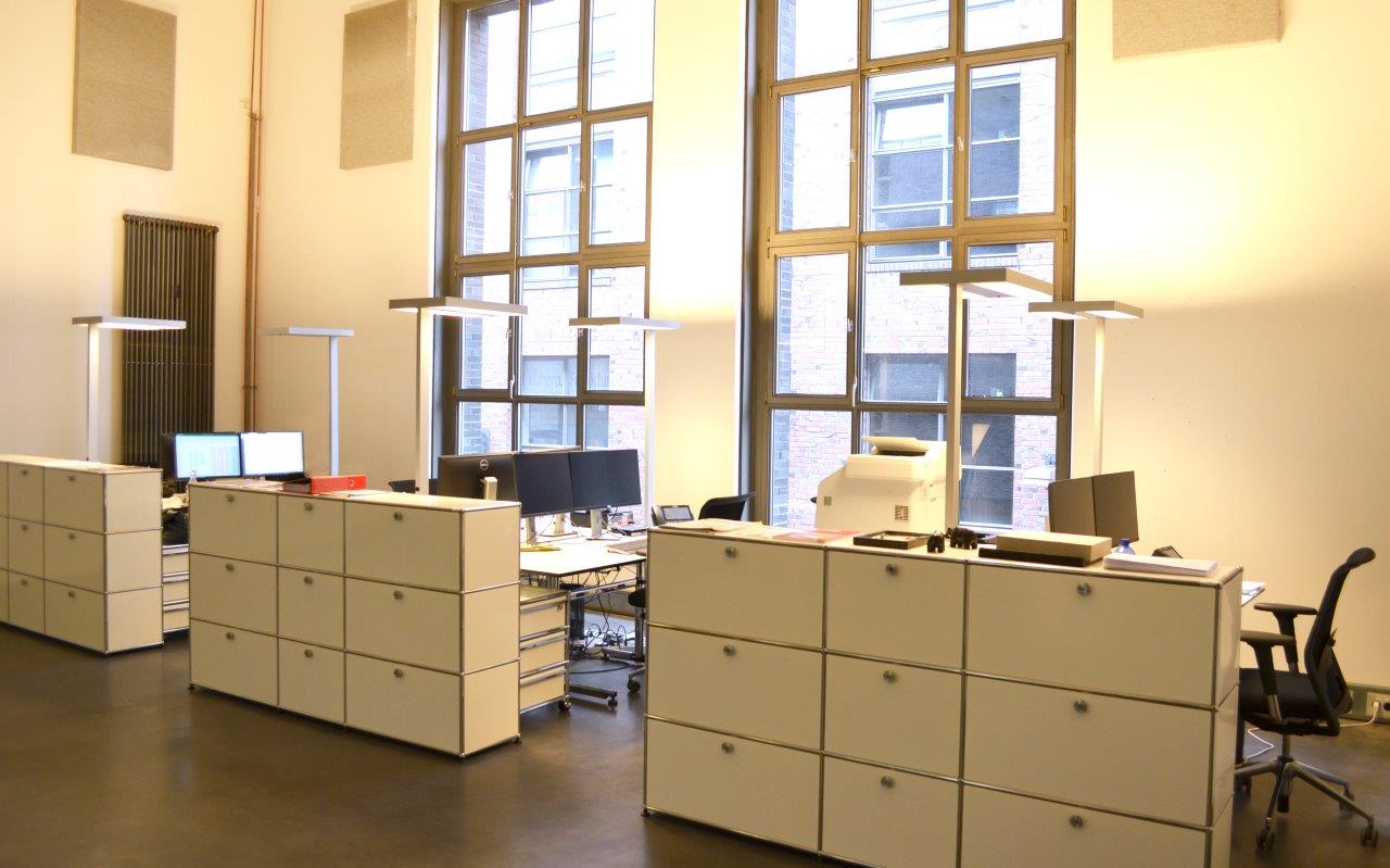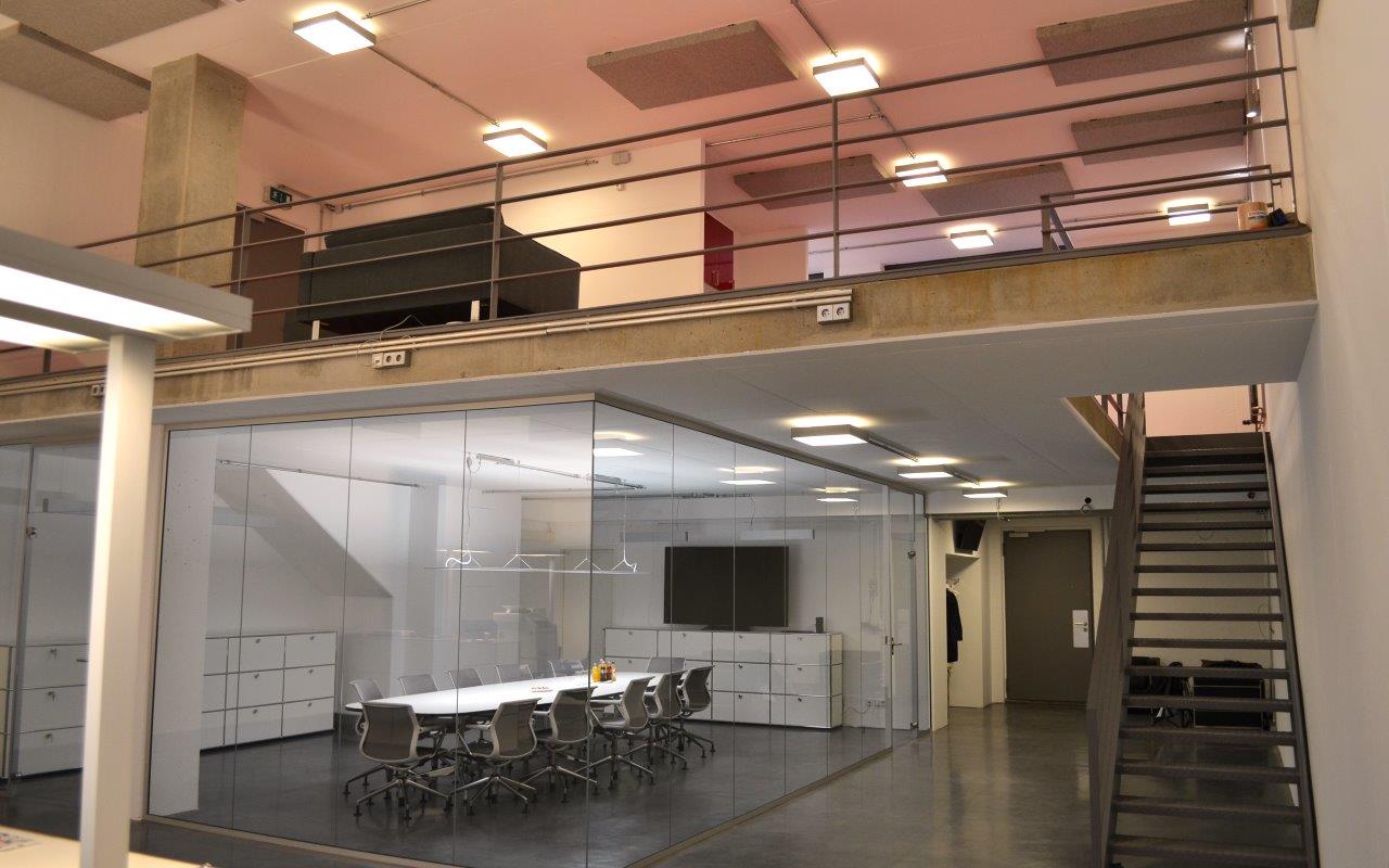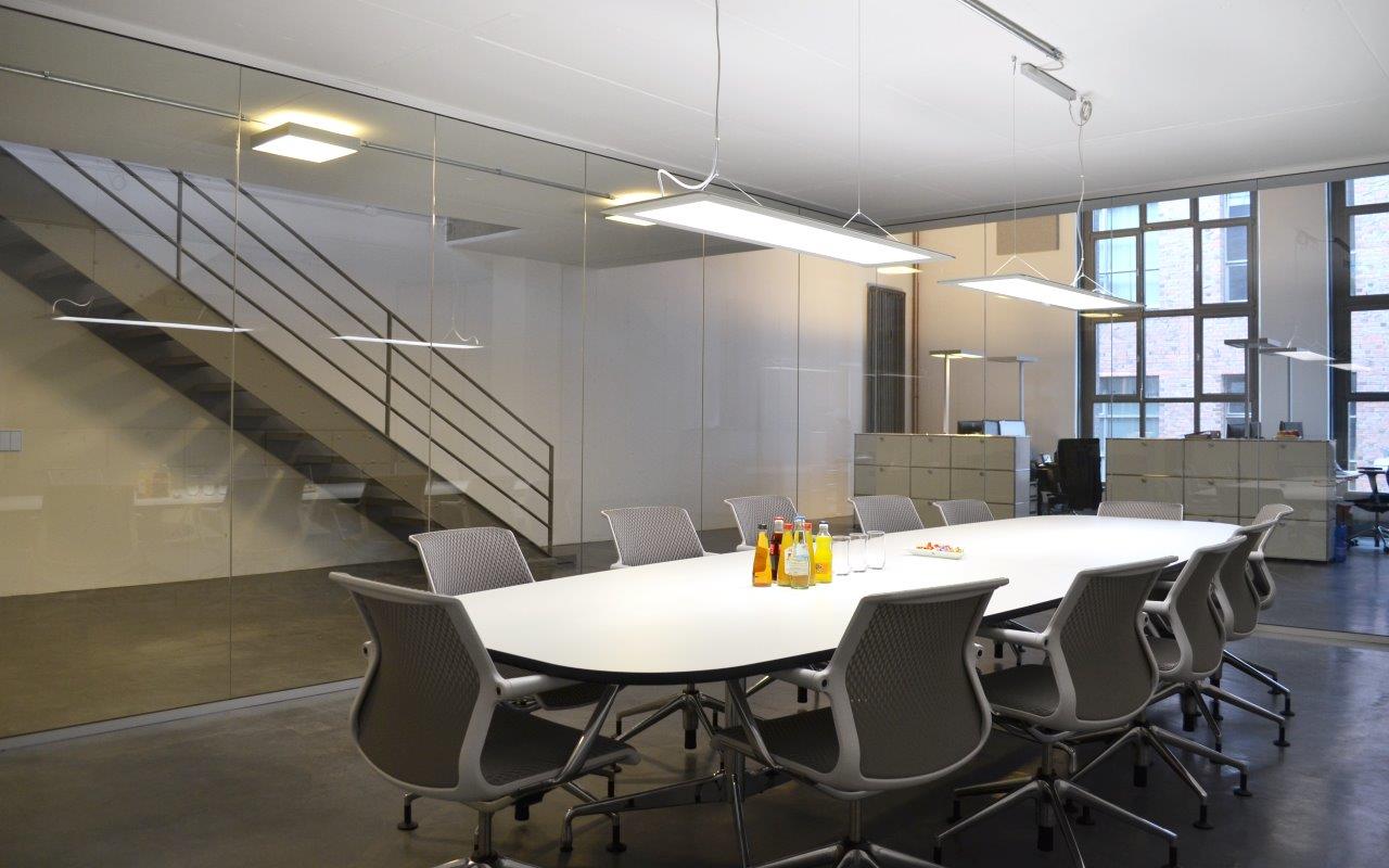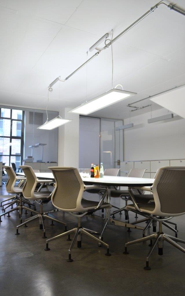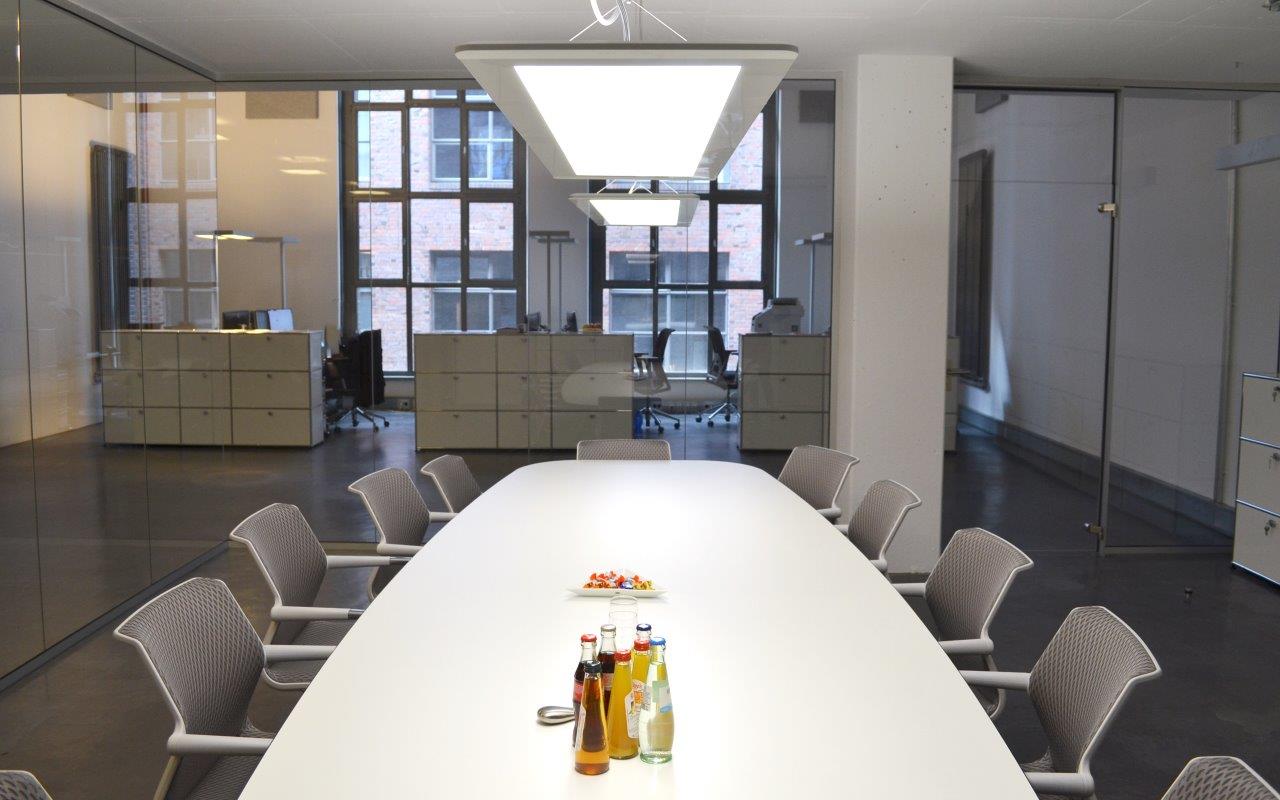 Neben den Konzeptionen hinsichtlich der Büroaufteilung, die unter anderem einen mit Glas abgetrennten Konferenzraum mit großem Besprechungstisch für mindestens 12 Personen vorgesehen hat, erstellte raum in form eine zeitgemäße Beleuchtungsplanung mit dem Einsatz neuartiger Schreibtischlampen, die mit dem „Design Plus“- Preis auf der Light & Building 2017 ausgezeichnet wurden.