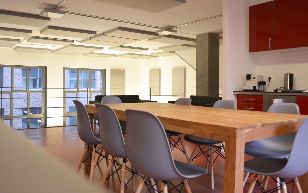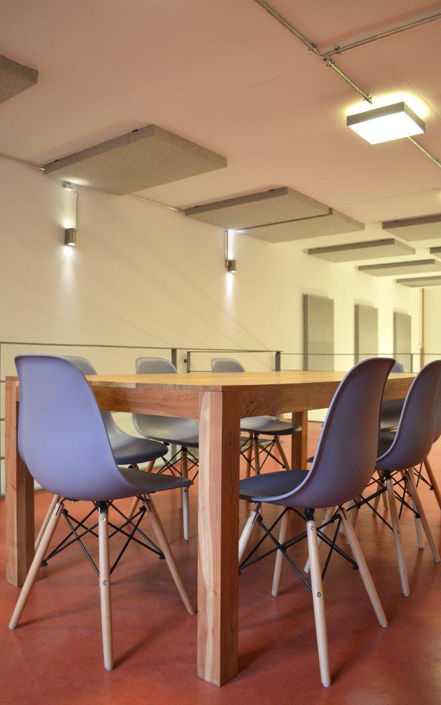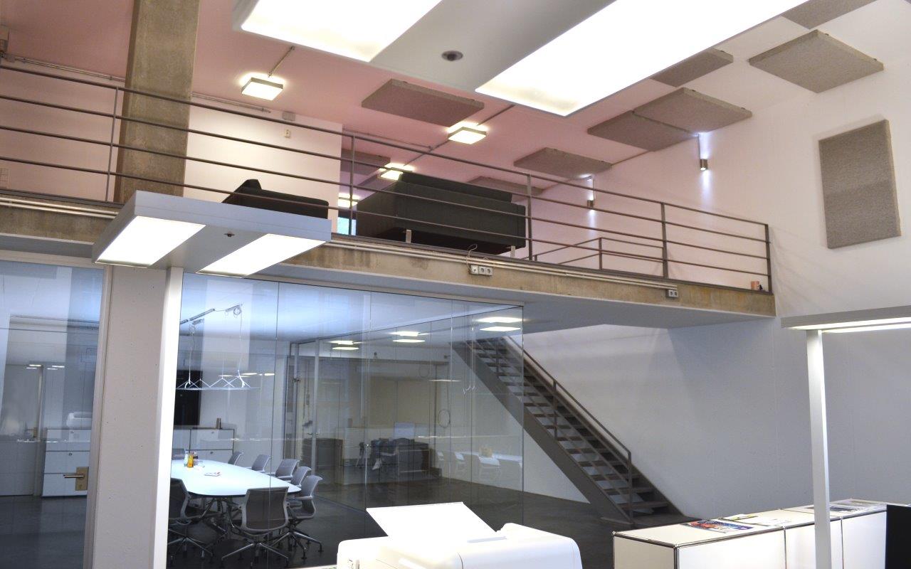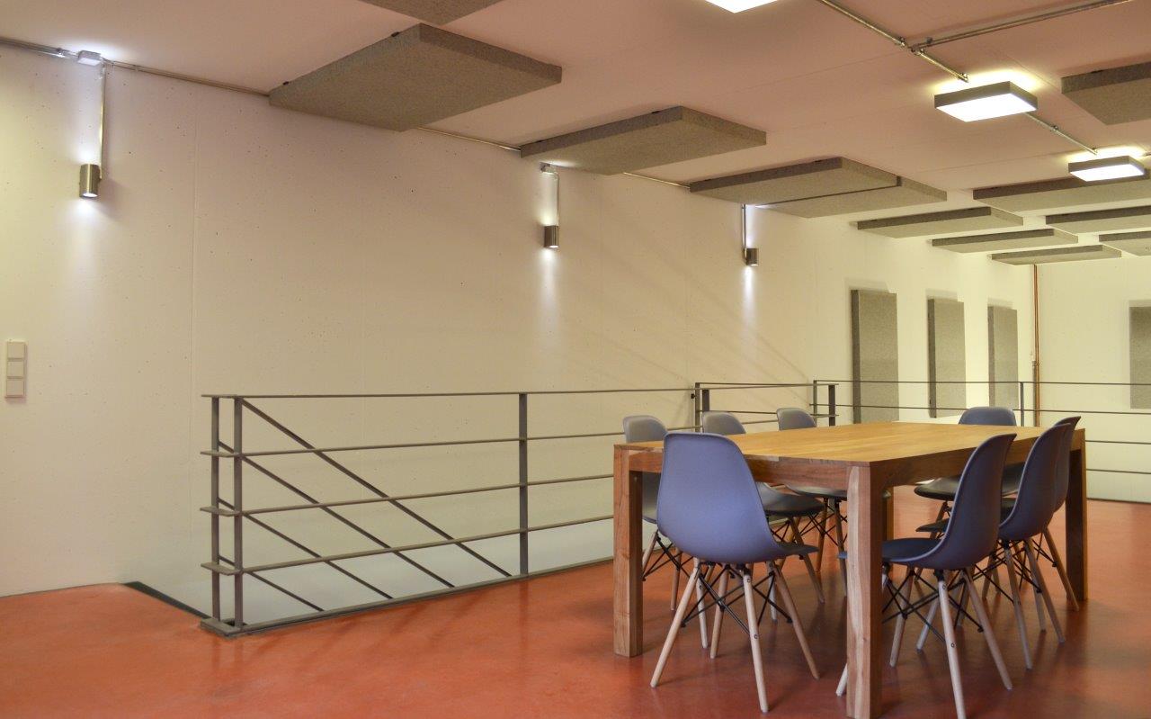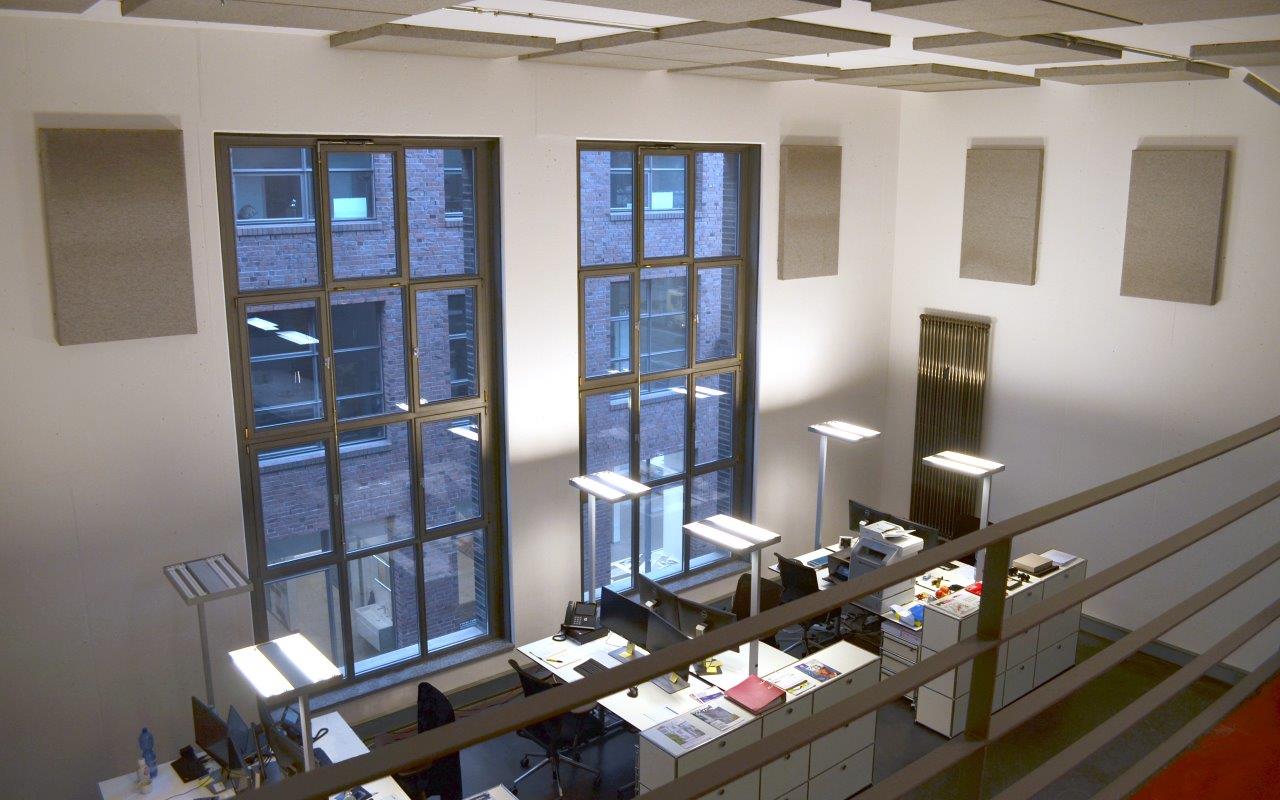 Im Anschluss an die Auftragserteilung, die die Erstellung eines Aufmaßes, die Entwicklung verschiedener Modernisierungs- und Einrichtungskonzeptionen und die komplette Projektsteuerung umfasste, wurden der Geschäftsleitung zunächst verschiedene Konzeptentwürfe vorgestellt inklusive eines von raum in form entwickelten Beleuchtungs- und Schallschutzkonzepts, bei dem z. B. durch das Anbringen von perforierten hinterleuchteten Schallschutzelementen an den Wänden der Geräuschpegel erheblich reduziert wird. Nachdem das finale Konzept erstellt und durch die Geschäftsleitung verabschiedet war, wurden die Ausführungsplanungen für die zu modernisierenden Bereiche sowie die Elektroplanung erstellt- gleichzeitig wurden der Geschäftsleitung verschiedene Produkt, Farb- und Materialvorschläge unterbreitet, die auf den besonderen Charakter der Büroräumlichkeiten vor Ort abgestimmt wurden.