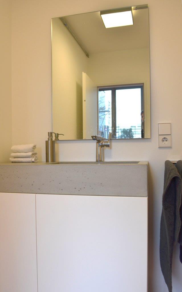 Der Zugang zum Konferenzraum kann sowohl vom Eingangsbereich als auch von den Arbeitsplätzen aus erfolgen, um den Mitarbeitern den Zugang zu vereinfachen. Die Trennwände bestehen komplett aus Glas, die somit ein angenehmes lichtdurchflutetes Arbeitsklima schaffen. raum in form konzipierte die Möblierung und Beleuchtung so, dass die Arbeitsplätze jederzeit um bis zu sechs weitere Plätze erweiterbar sind. Im 1. OG war der Wunsch des Bauherrn, einen angenehmen Mitarbeiterbereich zu schaffen, indem gemeinsam gekocht, gegessen und relaxt werden kann. Der Sanitärbereich wurde zeitgemäß modernisiert, ein moderner Betonwaschtisch mit Unterschrank, der viel Stauraum bietet, ist hierbei der Blickfang.