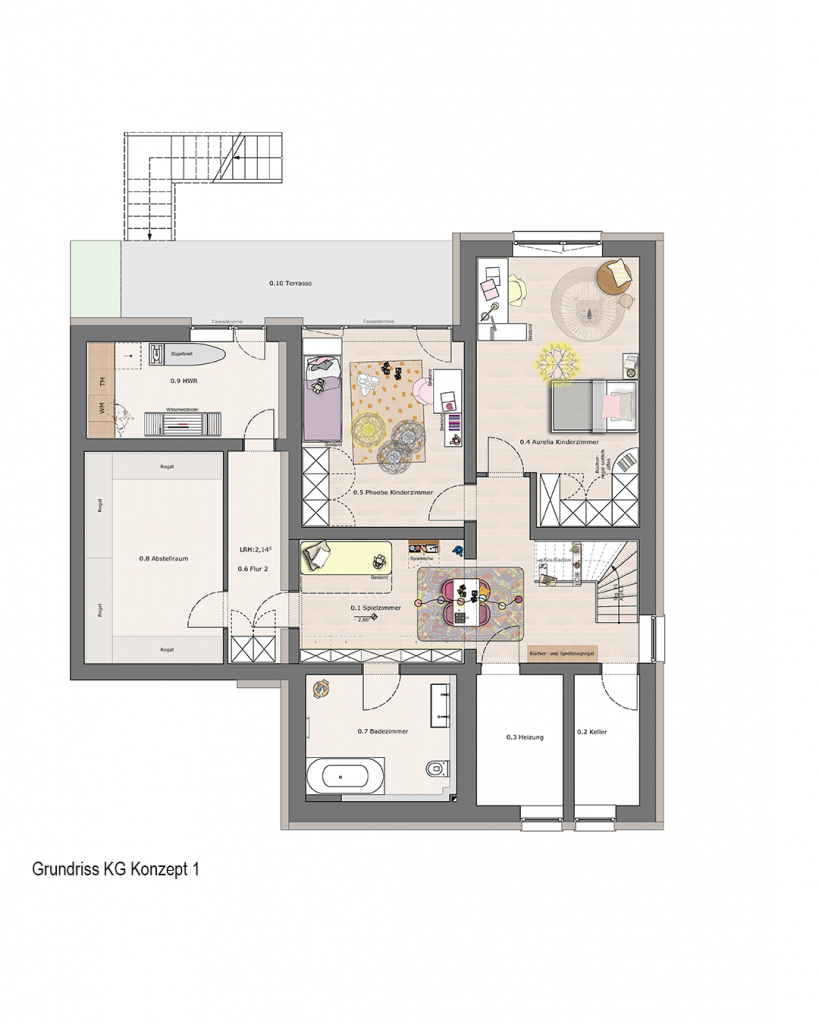 Anstelle des ursprünglich geplanten Kinderzimmers befindet sich dort nun ein Spielzimmer, das altersgerecht auf die Bedürfnisse der Kinder abgestimmt wurde.