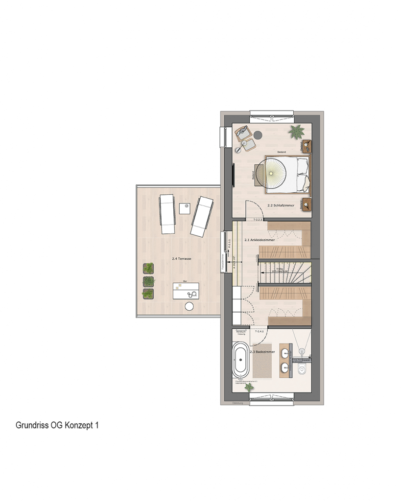 Das Dachgeschoss wurde in den beiden Konzepten unterschiedlich interpretiert und entsprechend den jeweiligen Schwerpunkten der Bauherren individuell ausgestaltet. Während in Konzept 1 das Dachgeschoss als exklusiver Elternbereich konzipiert wurde, orientiert sich Konzept 2 stärker an den ursprünglichen Überlegungen der Bauherren, bei denen auch ein Kinderzimmer auf dieser Etage vorgesehen war.