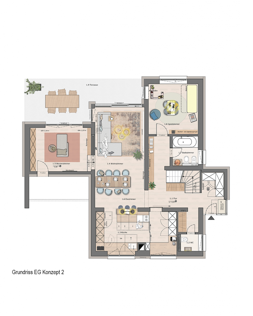 In dem Konzept 1 werden gezielte Eingriffe im Erdgeschoss vorgenommen, wobei die grundsätzliche Struktur des Bestands- Grundrisses weitgehend erhalten und daher nur wenige bauliche Änderungen notwendig machen.