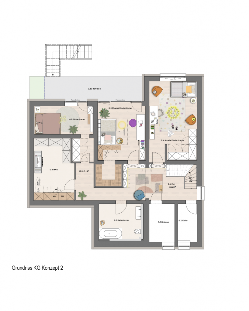 In Konzept 1 wurde die bestehende Grundstruktur des Kellergeschosses bewusst nur minimal verändert, um die vorhandenen Raumbeziehungen zu bewahren und gleichzeitig mit gezielten Maßnahmen mehr Wohnqualität zu schaffen. Die beiden Kinderzimmer wurden gartenseitig positioniert – dort, wo sich die besten Belichtungsverhältnisse bieten. Durch diese Anordnung erhalten die Räume nicht nur viel Tageslicht, sondern auch einen angenehmen Bezug zum Außenbereich, was insbesondere für Kinderzimmer einen bedeutenden Mehrwert darstellt.