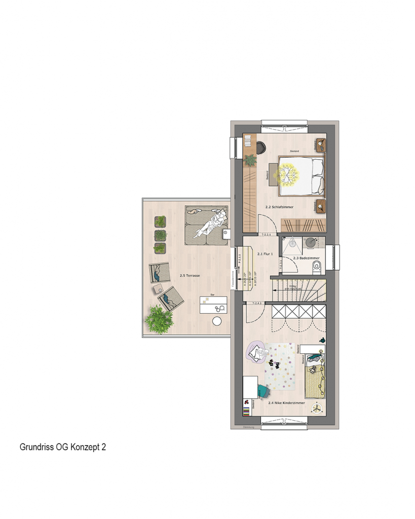 In Konzept 2 bleibt die bestehende Raumstruktur im Dachgeschoss weitgehend erhalten. Auf Wunsch der Bauherren wurde das Kinderzimmer in unmittelbarer Nähe zum Elternschlafzimmer eingeplant, was insbesondere für Familien mit kleineren Kindern eine praktische und alltagsnahe Lösung darstellt.