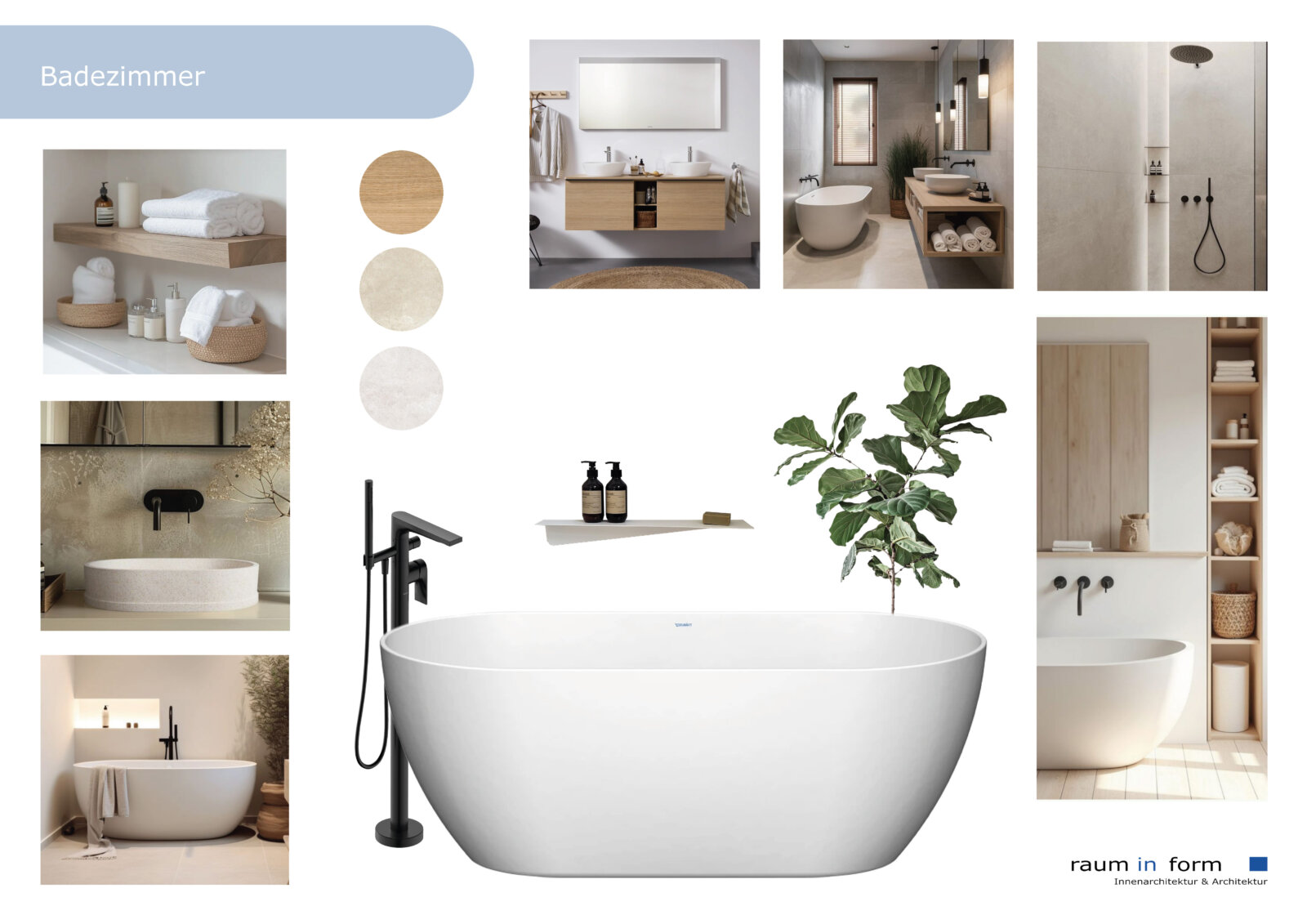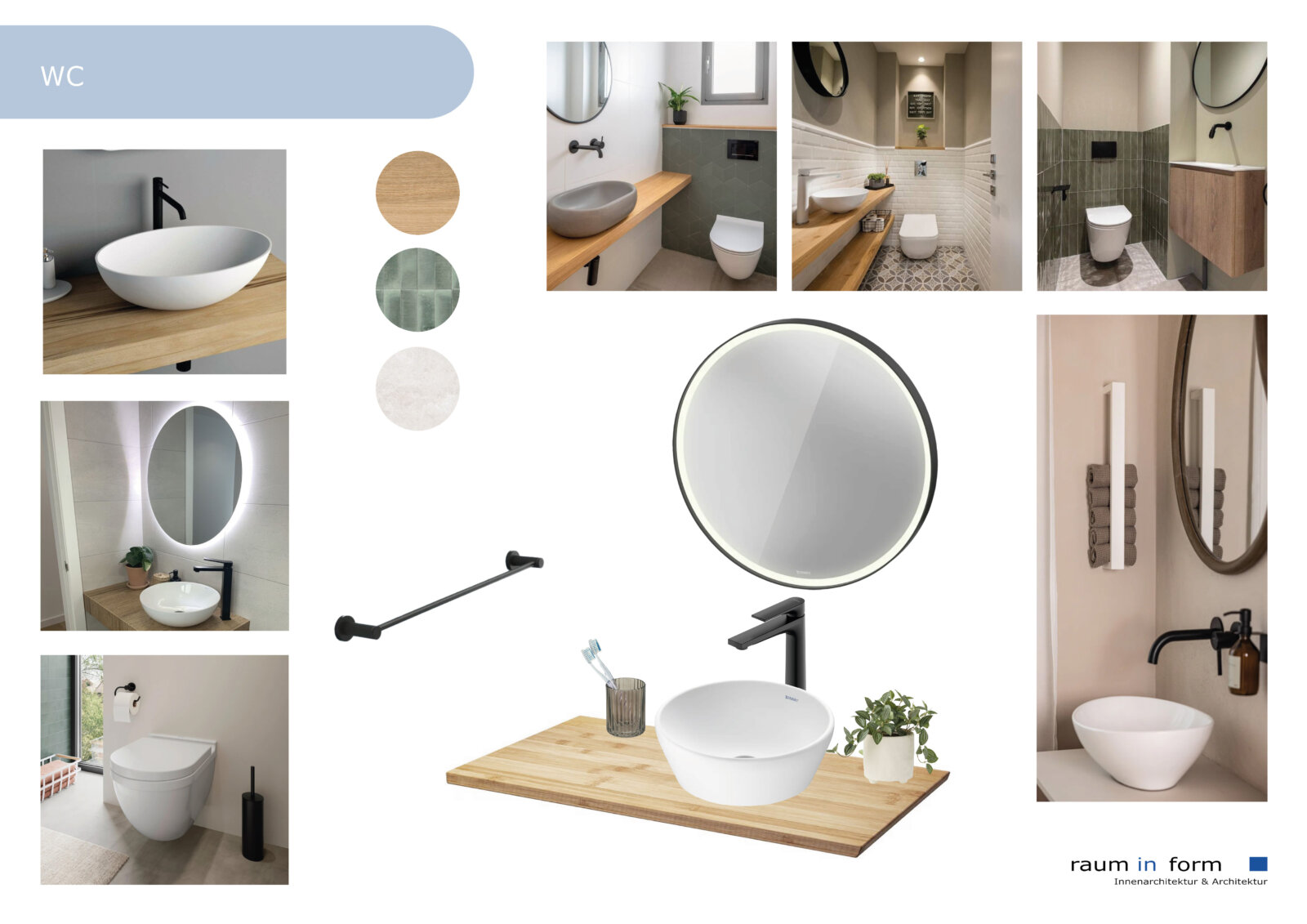 Das Badezimmer behält in diesem Konzept seine ursprüngliche Größe, wird jedoch modernisiert und funktional optimiert. Da auf eine Vergrößerung des Bades auf Wunsch der Bauherren verzichtet wurde, konnte im angrenzenden Flur eine großzügige Ablagefläche realisiert werden, die zusätzlichen Stauraum schafft. Die Garderobe im Eingangsbereich wird offen gestaltet und fügt sich harmonisch in das Flurkonzept ein.