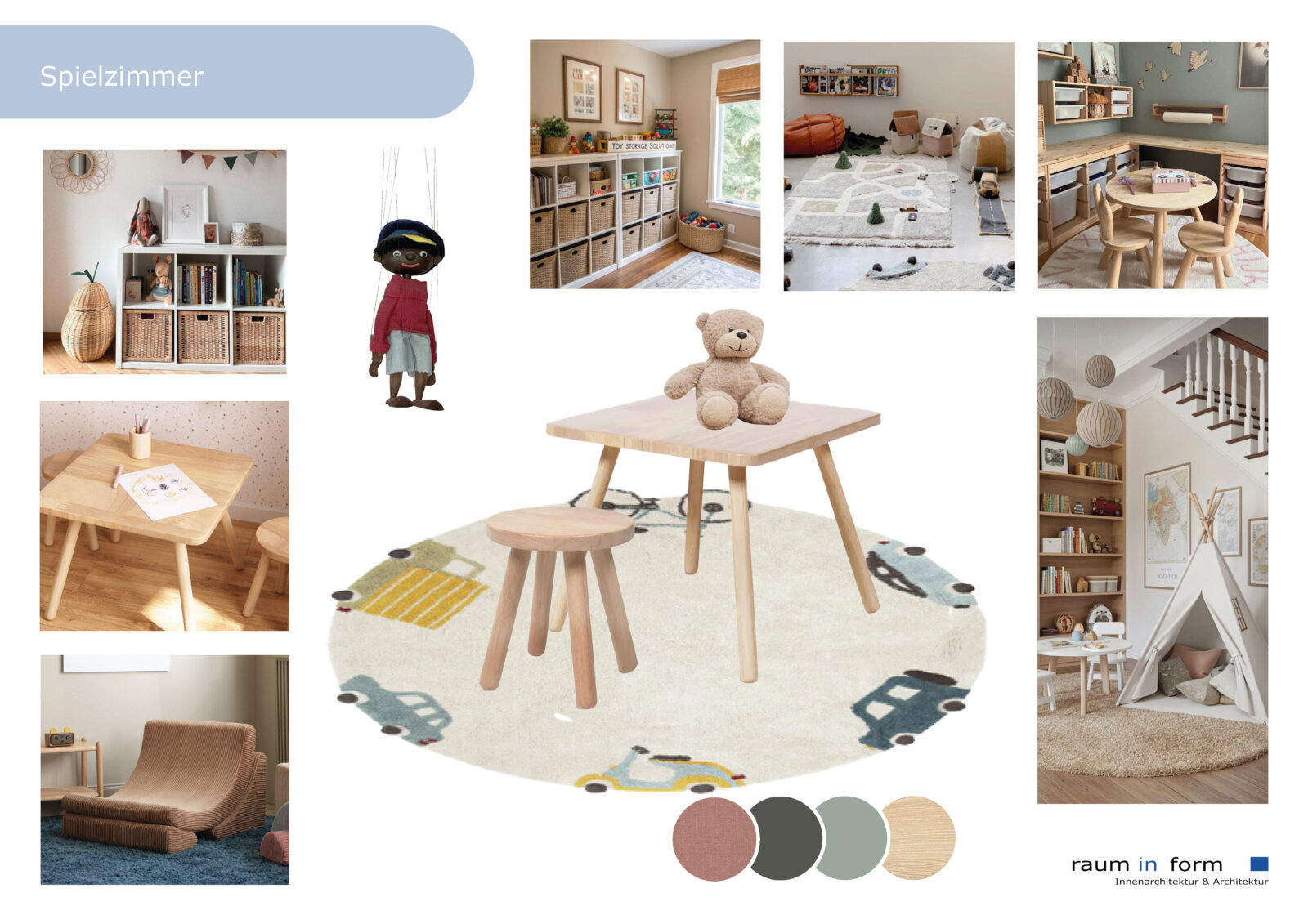 Anstelle des ursprünglich geplanten Kinderzimmers befindet sich dort nun ein Spielzimmer, das altersgerecht auf die Bedürfnisse der Kinder abgestimmt wurde.