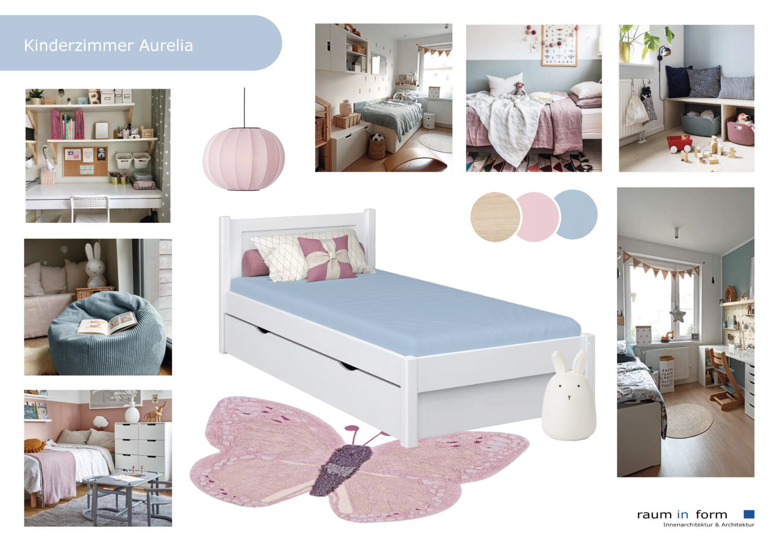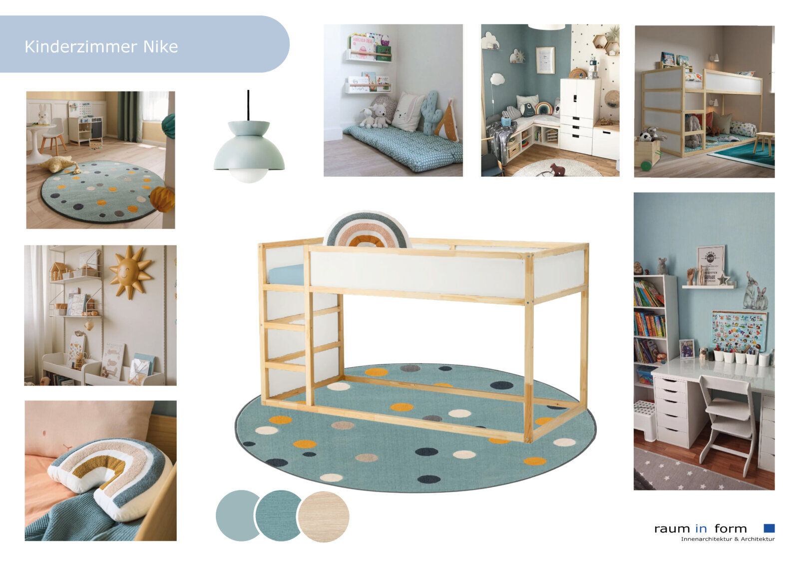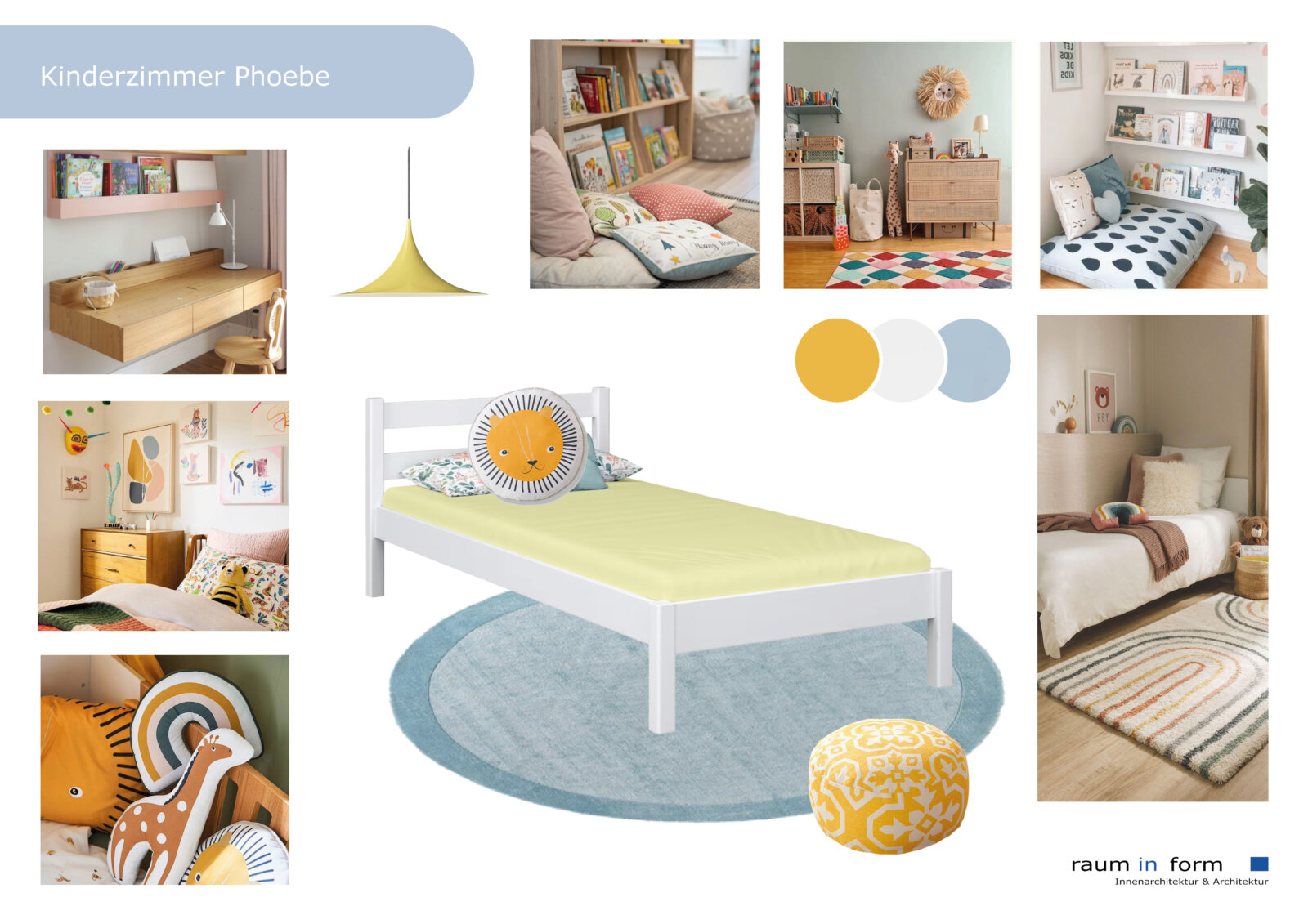 Besonders wichtig war es den Bauherren, in den Kinderzimmern genügend Stauraum zu schaffen. Dies wurde durch großzügige Kleiderschränke in allen entwickelten Konzepten berücksichtigt. Schreibtische und Regale aus dem Bestand der Bauherren wurden übernommen und finden ihren Platz in den Kinderzimmern wieder. Auch andere Möbel aus dem Bestand wurden in den Konzepten berücksichtigt und im gesamten Haus eingeplant.