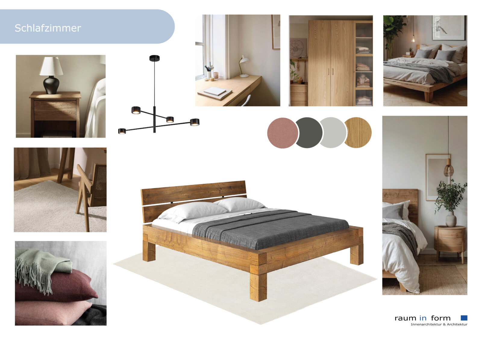 Bei der Innenraumplanung wurde großer Wert auf Stauraum und langfristige Nutzbarkeit gelegt. So wurden unter anderem durchdachte Möbeleinbauten vorgesehen, darunter auch eine Stauraumlösung, die nahtlos in einen Nachttisch übergeht – ein Beispiel für die individuelle Anpassung an die Bedürfnisse der Bewohner. Auch vorhandene Bestandsmöbel fanden in der Planung ihren festen Platz, um Kontinuität und Vertrautheit zu schaffen.
