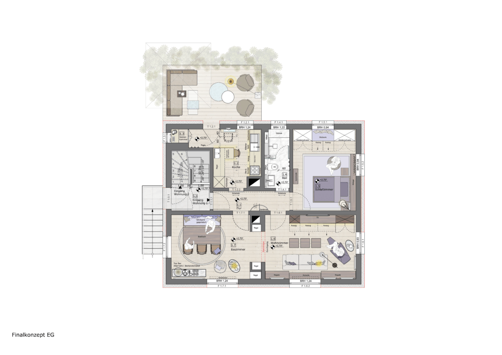 Die Entwurfsentwicklung erfolgte in enger Abstimmung mit der Bauherrin und das abschließende Finalkonzept wurde auf Grundlage zwei vorangegangener Konzeptvarianten abschließend finalisiert.