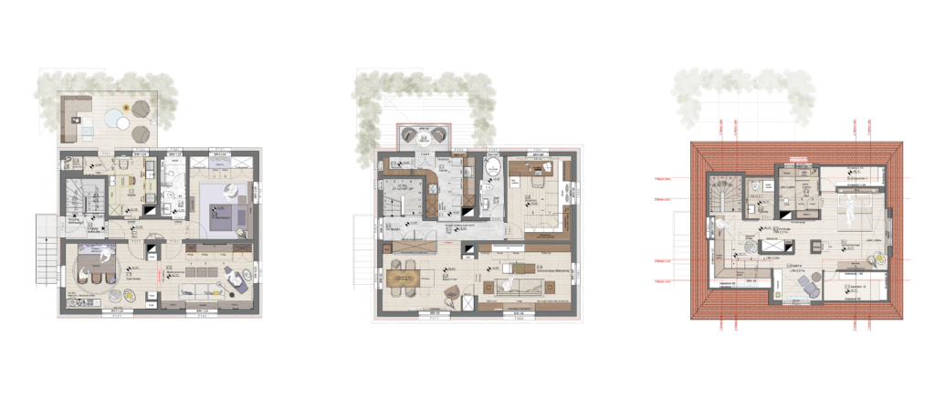 Die Elektroplanung umfasst die gesamte Hauselektrik und definiert einzelne Schaltkreise und die dazugehörigen Planzeichen für Einbau-, Aufbau,- oder Pendelleuchten. Die Elektroplanung wurde auf Grundlage des Finalkonzeptes mithilfe einer Beleuchtungskonzeption erstellt und verringert so die Zeiten für die anschließende Ausführungsplanung.