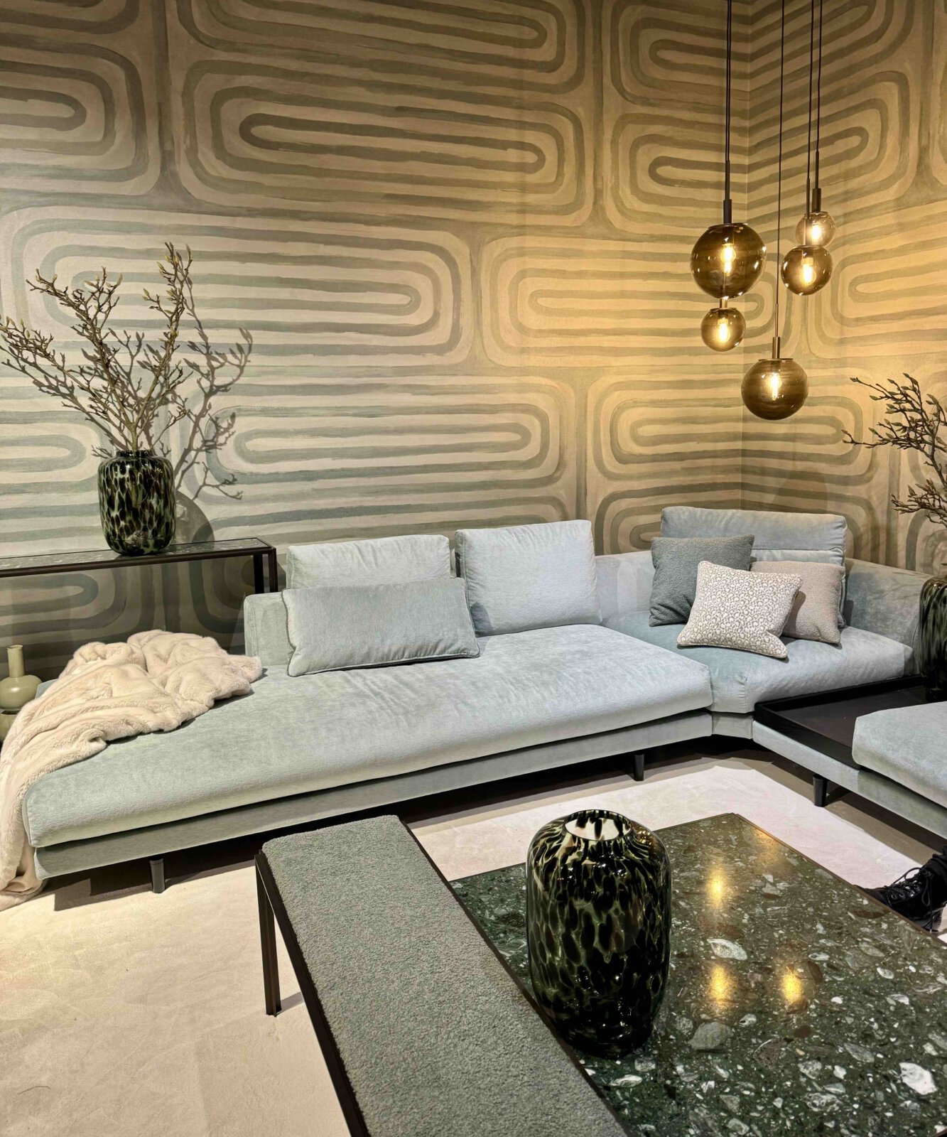 In unsicheren Zeiten sehnen die Menschen sich nach Rückzug und Geborgenheit. Eine beruhigende und taktile Gestaltung fördert ein entspanntes Wohnen. Sinnlich ansprechende und haptisch angenehme Stoffe, Muster und Texturen sind daher ebenfalls ein neuer Einrichtungstrend. Dazu passen Holz, Leder und Naturstein, die sich vermehrt auf Möbeloberflächen finden. Ausladend üppige Polstermöbel bieten Komfort und Nestwärme- so entstehen Räume, die Erdung und Verbundenheit ausstrahlen.