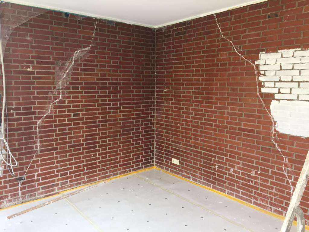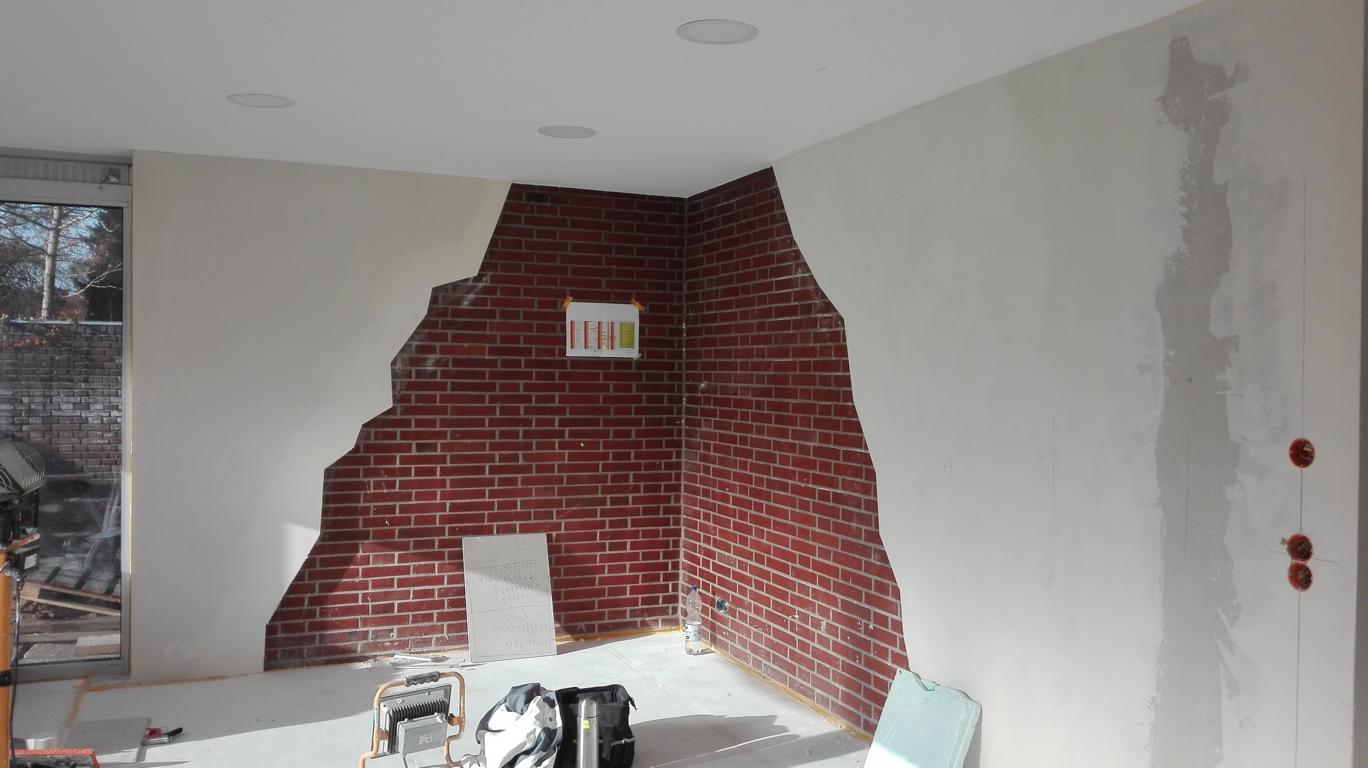 Die Oberfläche der roten Klinkerwand im Wohnbereich wurde mit einer neuen Licht- und Farbgestaltung aufgewertet. Die im Bestand vorhandene Holz-Kellertreppe wurde durch eine neue geschlossene Treppe ersetzt.